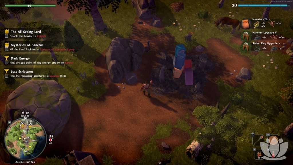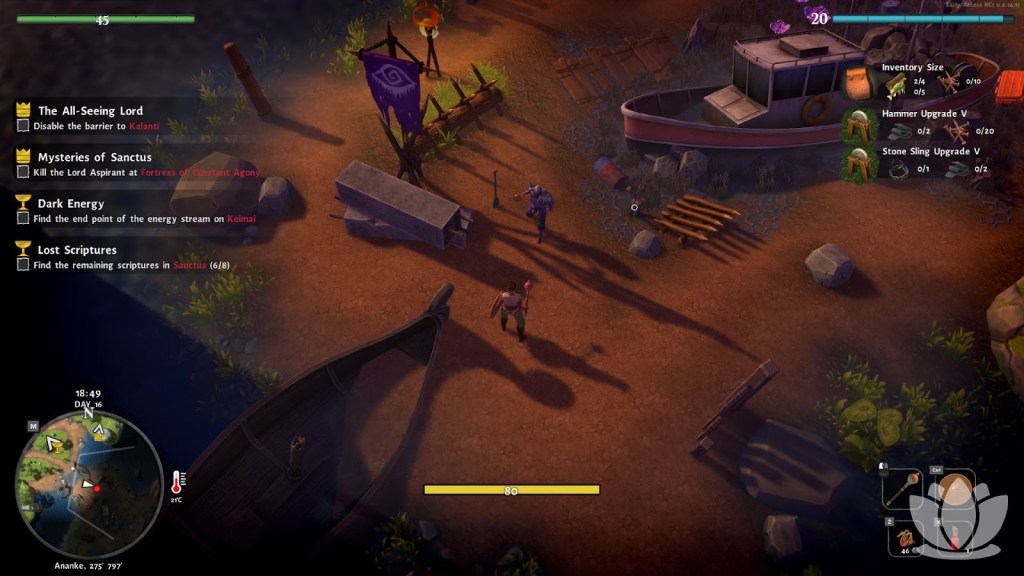 The game trickles down upgrades constantly, and that keeps you going. Can’t cut down a giant tree? The axe upgrade is just around the corner. Want to carry more stuff? Upgrade the backpack. It’s the standard survival gameplay loop, without hunger or sleep management. The sandbox is big, but exploration is the main motivation here, not the story or the visuals.