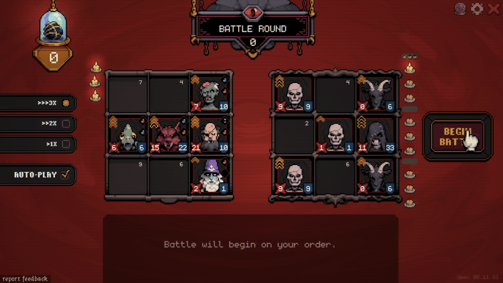 You’re able to see your opponent’s grid while you prepare, which allows you to plan ahead and consider your moves. In a battle, minions attack based on their position in the grid, meaning anyone you put in tile nine will move last.